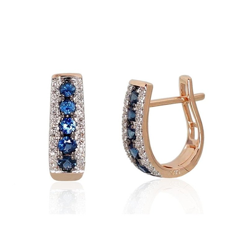 Gold earrings with 'english' lock, Red Gold 585°, Rhodium (Plating), Diamonds, Sapphire
